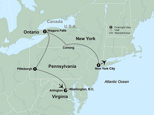 Get better acquainted with this iconic region of North America on a tour that features Washington, D.C.; Pittsburgh, Pennsylvania; Niagara Falls and New York, New York. Begin your journey in America’s capital city, Washington, D.C., on a guided city tour where you’ll see panoramic views of the Capitol building and the White House. Continue on to Pittsburgh, commonly known as ”Steel City” and “the City of Bridges.” In Niagara Falls, get an up-close look at the mighty falling waters when you cruise to the base of this powerful natural wonder. Your East Coast journey ends in New York City, where you’ll immerse yourself in the energizing bustle of the “Big Apple.” Enjoy a locally guided city tour and visit poignant sites like the 9/11 Museum and Memorial.