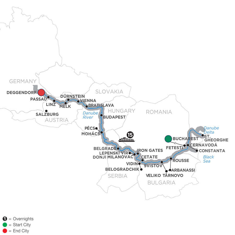Day 1 Bucharest–Fetesti (Embarkation): onboard welcome receptionDay 2 St. Gheorghe: excursion to Danube Delta; km 0 celebration Day 3 Cernavodă. Excursion to Constanta: guided sightseeing, visit the National History and Archaeological Museum in ConstantaDay 4 Rousse. Excursion to Veliko Târnovo & Arbanassi: guided sightseeing, visit Tsarevet’s Fortress in Veliko Târnovo, and the Ethnographic Museum and the Church of the Nativityin Arbanassi; or guided sightseeing of RousseDay 5 Vidin–Belogradchik: guided sightseeing to Vidin’s fortress and see the rock formations in BelogradchikDay 6 Iron Gates–Donji Milanovac: cruise through the Iron Gates gorge; visit Lepenski Vir archaeological siteDay 7 Belgrade: guided sightseeing; lecture on boardDay 8 Mohács. Excursion to Pécs: guided tour and organ concert in PécsDay 9 Budapest: day at leisureDay 10 Budapest: guided tour, see Heroes’ SquareDay 11 Bratislava: guided sightseeing, visit St. Martin’s CathedralDay 12 Vienna: guided tour, see the Kuntskammer’s collection; choice of additional sightseeing, or a complimentary museum ticketDay 13 Dürnstein–Wachau Valley–Melk: choice of guided walk, or hike up to the castle ruins in Dürnstein; guided visit of the Benedictine Abbey in Melk; wine tastingDay 14 Linz: guided walkDay 15 Passau: guided walkDay 16 Deggendorf (Disembarkation): your vacation ends this morning